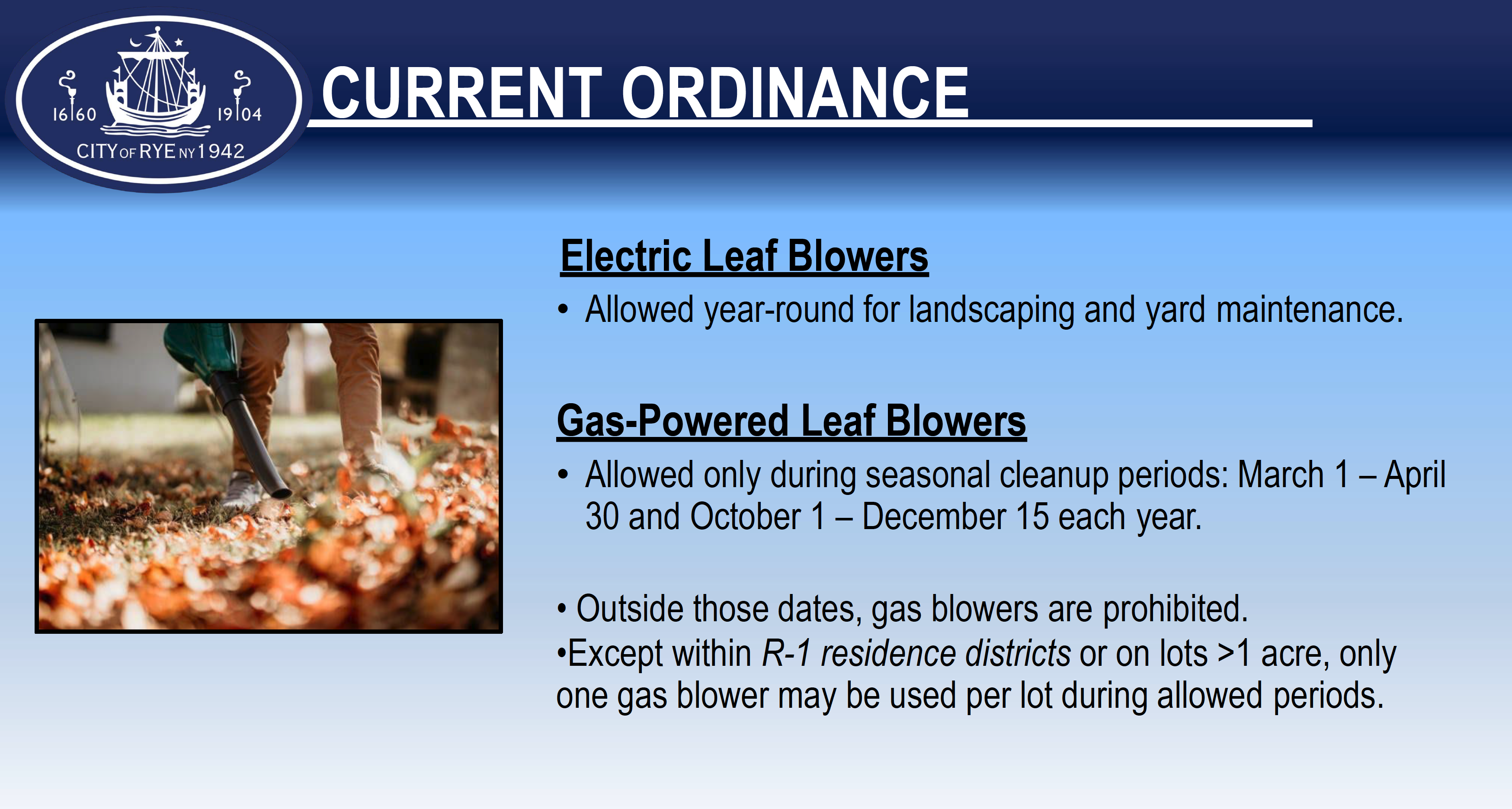The City will hold a public hearing on proposed changes to the local leaf blower law. Use this page to learn more about the proposal, share your comments, and read feedback from others.